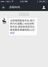 關注后會自動彈出立即綁定的消息,點擊綁定賬號。